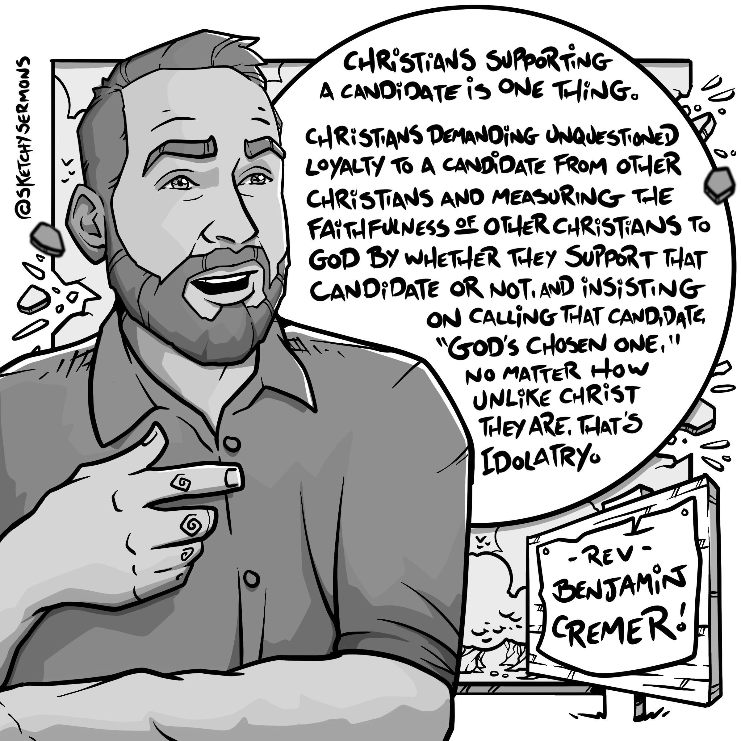 Christians demanding unquestioned loyalty to a candidate, measuring other Christians’ faith by their fidelity to that candidate, and calling that candidate “God’s chosen one,” no matter how unlike Christ they are, that’s idolatry.”